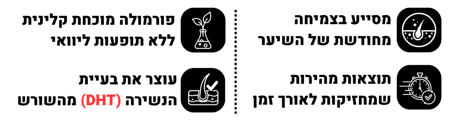 הפורמולה מחזקת את זקיקי השיער, משפרת זרימת דם ומאזנת את רמות ה-DHT — ההורמון שמאיץ התקרחות אצל גברים ונשים.