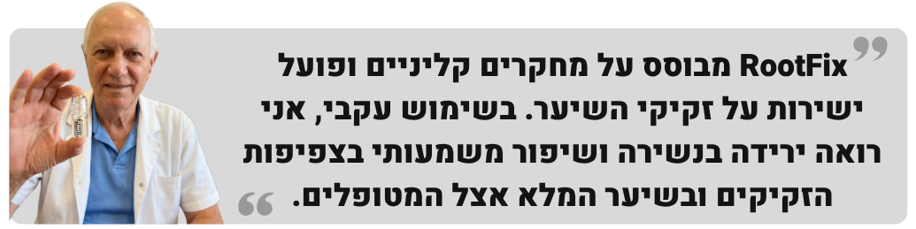 אחרי 40 שנות מחקר ומעל 600 פרסומים בנושא מחלות שיער, אני יכולה לומר שהעתיד הוא בטיפול טופיקלי ממוקד. ערכת RootFix משלבת מיקרו-החדרה עם סרום שמכיל ג׳ינסנג, רוזמרין ודקל ננסי — רכיבים שהמחקר מראה שחוסמים DHT ומעוררים זקיקים. היתרון הגדול: הכל מגיע ישירות לשורש, בלי תופעות הורמונליות מערכתיות כמו בפינסטריד. פעם בשבוע, 5 דקות — וההיענות של המטופלים גבוהה בהתאם.